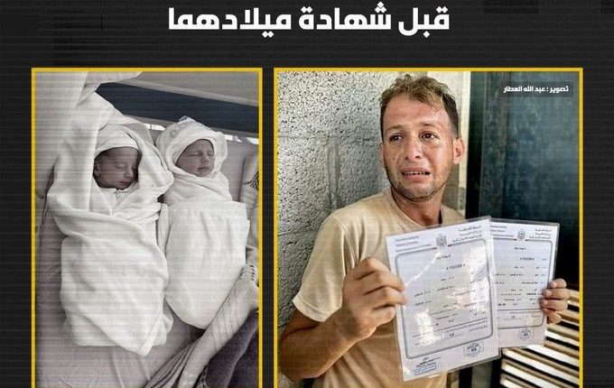 متابعات: كشفت مصادر فلسطينية عن استشهاد توأم رضيعين بعمر 4 أيام مع أمهما بقصف للعدو الصهيوني استهدف منزلهم وبشكل مباشر ومتعمد في دير البلح وسط قطاع غزة وذلك اثناء ما كان ولدهما يعمل على استخراج شهادتي ميلادهما ليتفاجأ اثناء عودته ان طفلاه وأمهما قد استشهدوا.. حسبنا الله ونعم الوكيل. وبحسب بيان لوزارة الصحة في غزة […]