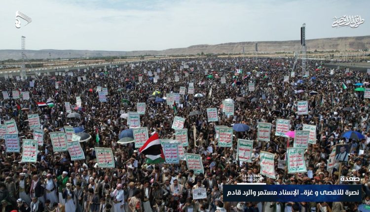 أبناء صعدة يحتشدون في 24 ساحة دعماً لفلسطين تحت شعار (نصرة للأقصى وغزة.. الإسناد مستمر والرد قادم)