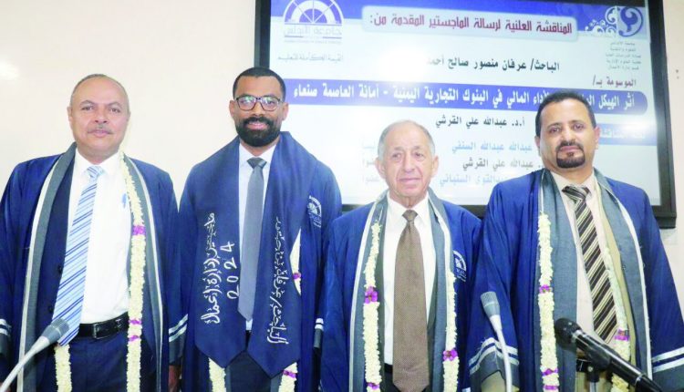 الثورة / نال الباحث عرفان منصور صالح بن حبتور، درجة الماجستير من جامعة الأندلس للعلوم والتقنية، في إدارة الأعمال، عن رسالته الموسومة بـ”أثر الهيكل المالي على الأداء المالي في البنوك التجارية اليمنية – أمانة العاصمة صنعاء”. وأشادت لجنة المناقشة والحكم، برئاسة الدكتور عبدالله عبدالله السنفي مناقشاً، وعضوية الدكتور عبدالله علي القرشي مشرفاً رئيسياً، والدكتور […]