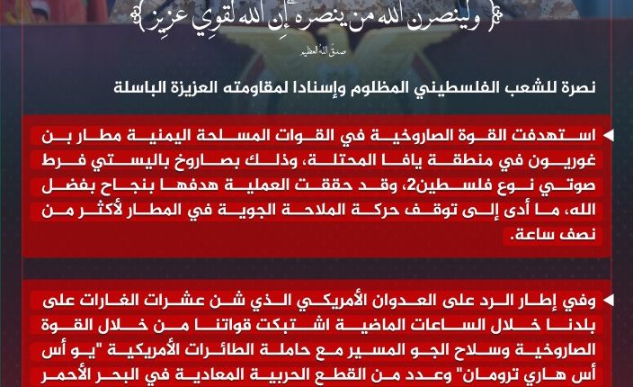 بيان قصف مطار بن غوريون بصاروخ فلسطين2، والاشتباك مع حاملة الطائرات الأمريكية ” ترومان” وعدد من القطع الحربية المعادية