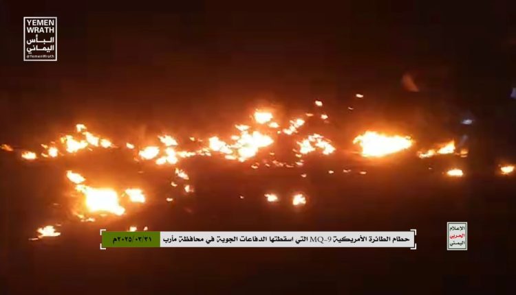 شاهد | حطام الطائرة الأمريكية #MQ_9 التي تم إسقاطها أثناء قيامها بأعمال عدائية في أجواء محافظة #مأرب بصاروخ أرض-جو محلي الصنع 02-10-1446 | 31-03-2025