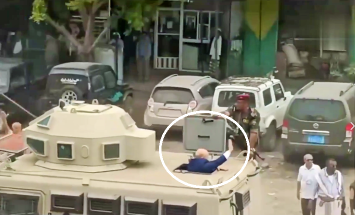 تعز / وكالة الصحافة اليمنية // ظهر رئيس “مجلس القيادة” التابع للتحالف رشاد العليمي أثناء وصوله إلى مدينة تعز على متن إحدى المدرعات السعودية بمشهد ساخر أمام المواطنين. وتعرض العليمي للسخرية من قبل رواد مواقع التواصل الاجتماعي أمس الثلاثاء إثر ظهوره عبر فتحة صغيرة من المدرعة السعودية ملوحا بيديه للمواطنين، واصفين ذلك الظهور بالمخزي.