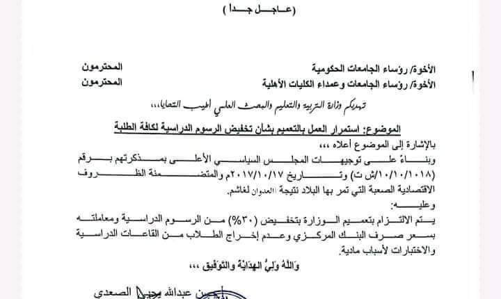صنعاء/وكالة الصحافة اليمنية// وجهت وزارة التربية والتعليم والبحث العلمي بحكومة صنعاء العمل وفق تعميم جديد على جميع الجامعات الحكومية والخاصة. وقضى التعميم الوزاري توجيه حسن الصعدي وزير التربية والتعليم والبحث العلمي باستمرار العمل بمنح الطلاب تخفيض ٣٠% من نسبة الرسوم الدراسية. واكد التعميم ان التخفيض جاء بناء على توجيهات المجلس السياسي الاعلى الصادرة في 2017 […]