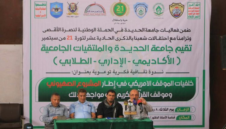 ندوة فكرية بجامعة الحديدة بعنوان “خلفيات الموقف الأمريكي في إطار المشروع الصهيوني وموقف القرآن الكريم في المواجهة”