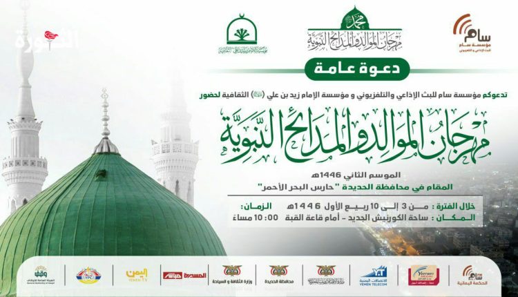 الثورة نت / أحمد كنفاني تنطلق في العاشرة من مساء اليوم الجمعة، بساحل كورنيش مدينة الحديدة، فعاليات مهرجان الموالد والمدائح النبوية “الموسم الثاني”، بمناسبة ذكرى المولد النبوي الشريف على صاحبه وآله أفضل الصلاة والتسليم للعام 1446هـ. ويتضمن المهرجان، الذي تنظمه مؤسسي سام للبث الاذاعة والتلفزيوني والإمام زيد بن علي الثقافية خلال الفترة “3-10″ربيع الأول […]