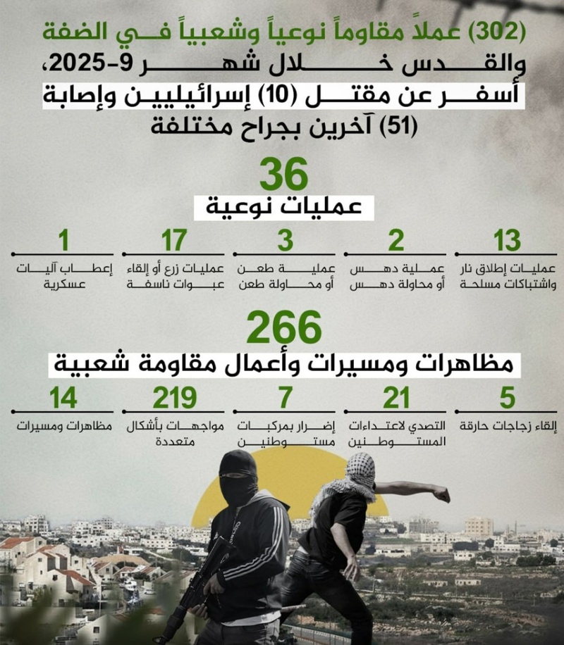 الثورة نت /.. أفاد مركز معلومات فلسطين “مُعطى” اليوم الخميس، أن المقاومة الفلسطينية في الضفة الغربية والقدس نفذت خلال شهر سبتمبر المنصرم،302 عملاً مقاوماً نوعياً وشعبياً، أسفرت عن مقتل 10 “إسرائيليين” وإصابة 51 آخرين بجراح متفاوتة. وذكر “معطى”، في تقرير ، أن شهر سبتمبر شهد 36 عملية نوعية، توزعت على: 13 عملية إطلاق نار واشتباكات […]