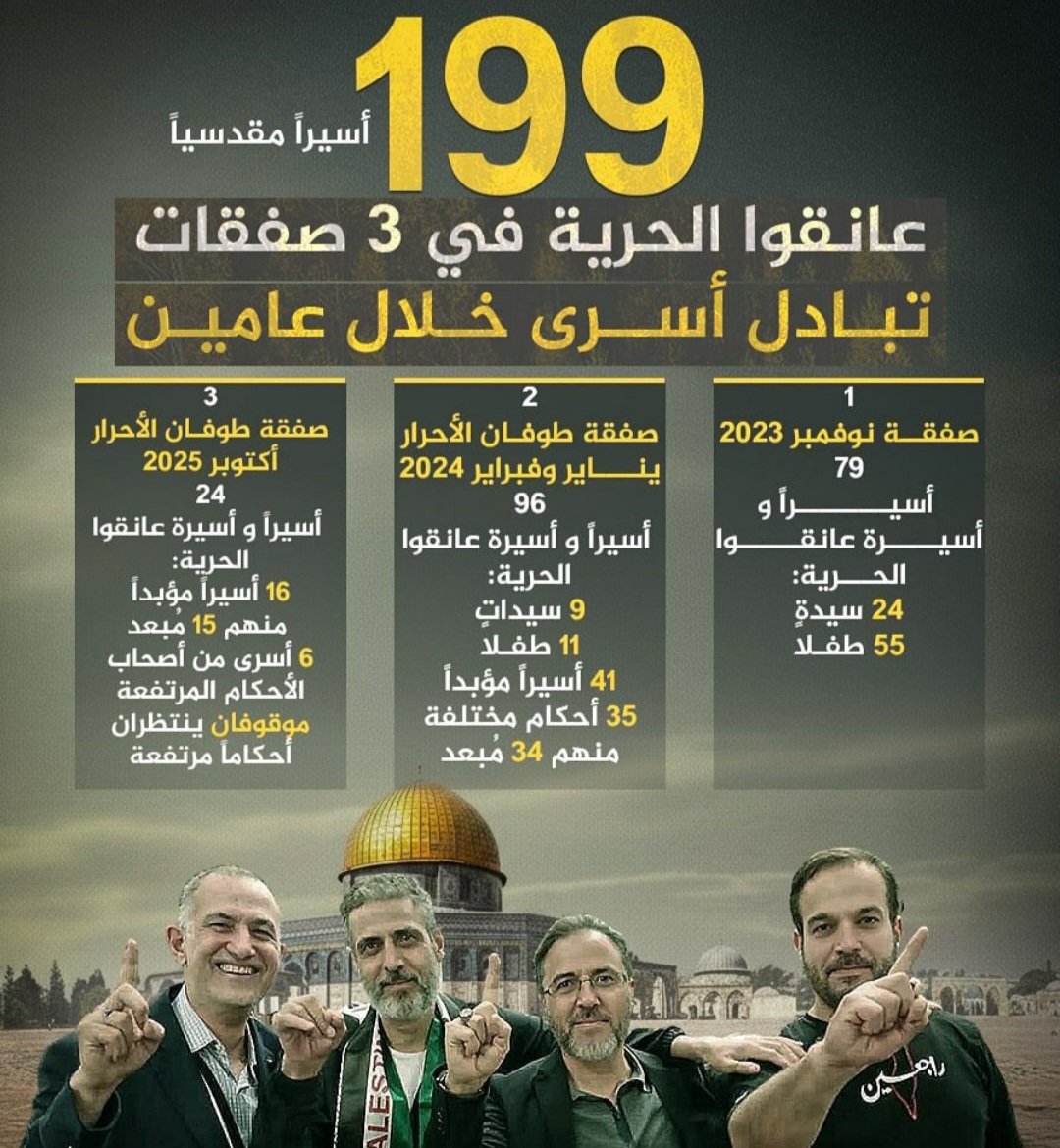 الثورة نت /.. أفاد مركز معلومات فلسطين (معطى)، اليوم الثلاثاء، بأن 199 أسيراً مقدسياً عانقوا الحرية خلال عامين عبر ثلاث صفقات تبادل مع العدو الإسرائيلي. وقال المركز في تقرير إحصائي، ، إن أولى هذه الصفقات كانت في نوفمبر 2023، حيث أفرج عن 79 أسيراً وأسيرة، منهم 24 امرأة و55 طفلاً. وأضاف أن صفقة “طوفان الأحرار” […]