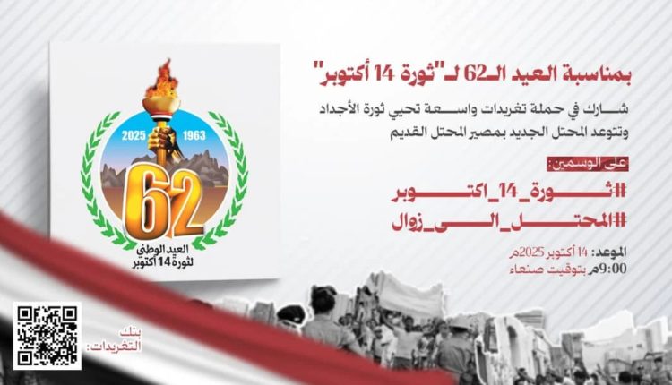 The post حملة تغريدات واسعة تنطلق مساء اليوم إحياءً لذكرى ثورة 14 أكتوبر الـ 62 first appeared on موقع صنعاء سيتي.