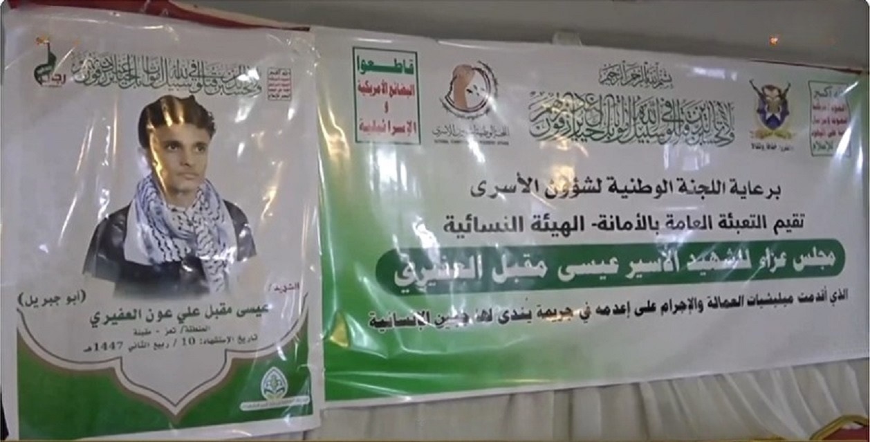 يمانيون | نظّمت الهيئة النسائية بمكتب أمانة العاصمة، بالتنسيق مع اللجنة الوطنية لشؤون الأسرى، مجلس عزاءٍ نسائيًّا واسعًا للشهيد الأسير عيسى العفيري، الذي أقدمت أدوات العدوان الأمريكي السعودي في تعز على تصفيته داخل المعتقل في جريمةٍ نكراء تهزّ الضمير الإنساني وتكشف زيف شعارات العدالة والحرية التي يتغنّى بها الغرب. وفي المجلس الذي شهد حضورًا نسائيًا […]