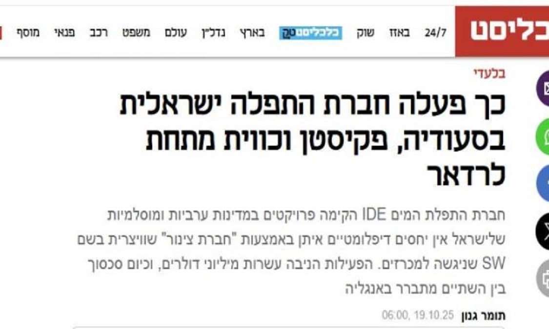 يمانيون | كشفت تحقيقات صحفية أن شركة إسرائيلية متخصصة في تحلية المياه تُدعى “IDE” نجحت خلال العقد الماضي في اختراق أسواق عدة دول عربية وإسلامية، من بينها السعودية والكويت وباكستان، محققة مئات الملايين من الدولارات، عبر آلية تمويهية تعتمد على شركة وسيطة مقرّها سويسرا تُدعى “Swiss Water”. وأوضحت صحيفة “كالكاليست” الاقتصادية الإسرائيلية أن الشركة الإسرائيلية، […]