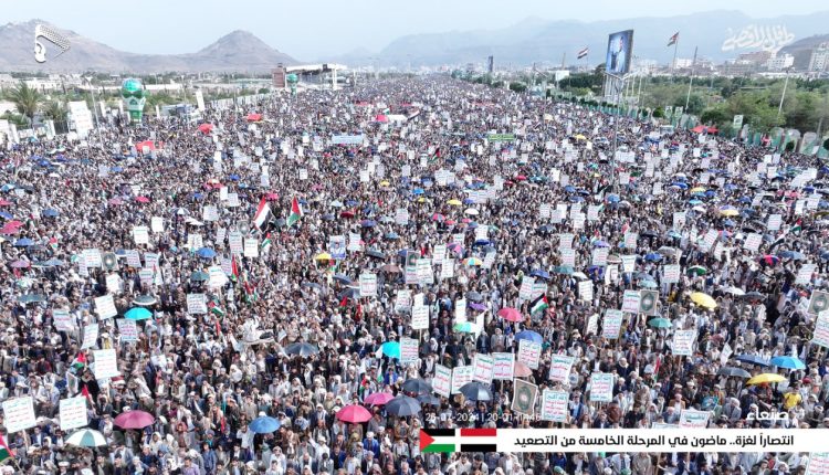 يمني برس| احتشد الملايين إلى ميدان السعبين أكبر ميادين العاصمة صنعاء، عصر اليوم الجمعة، تحت شعار (انتصارا لغزة.. ماضون في المرحلة الخامسة من التصعيد) في طوفان بشري متجدد نصرة وإسنادا للشعب الفلسطيني وردا غاضبا على العدوان الصهيوني على الحديدة. ويتميز خروج هذا الأسبوع أنه جاء بالتزامن مع العدوان الصهيوني على بلادنا، وجاء استجابة لدعوة السيد […]