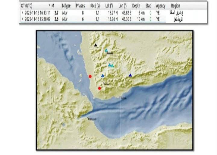 الثورة نت/ رشاد الجمالي سجلت محطات مركز رصد ودراسة الزلازل والبراكين، اليوم خمس هزات ارضية في محافظات ذمار والحديدة وتعز. وأوضح رئيس مركز رصد ودراسة الزلازل والبراكين بالمحافظة في تصريح لـ “الثورة نت” أن المركز سجل هزتين أرضيتين غير محسوستين شرق مدينة ذمار، الأولى بقوة 1.7 درجة الساعة 3.0 فجرا، والثانية بقوة 1.8 درجة الساعة […]