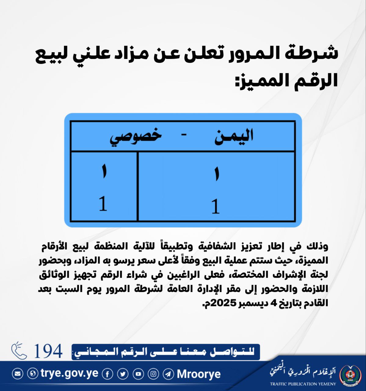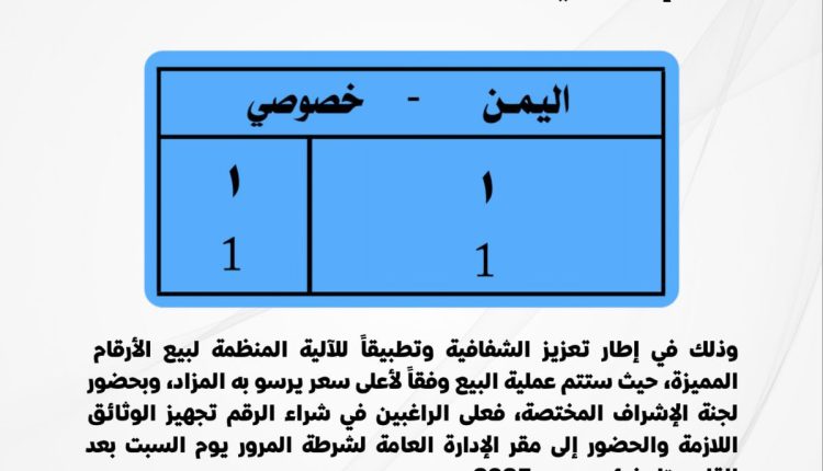صنعاء.. شرطة المرور تعرض لوحة مدنية برقم نادر في مزاد علني Share نوفمبر 20, 2025 صنعاء | وكالة الصحافة اليمنية الذهاب إلى المصدر Share FacebookTwitterGoogle+ReddItWhatsAppPinterestEmail