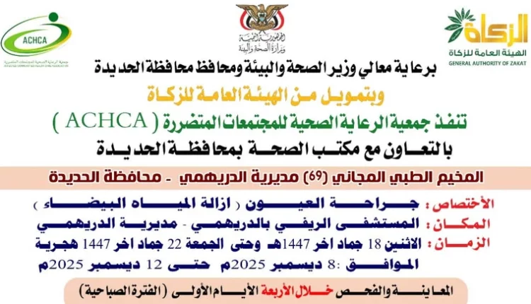 يمني برس | تدشن جمعية الرعاية الصحية للمجتمعات المتضررة، الاثنين القادم، المخيم الطبي المجاني الـ69 لجراحة العيون في مستشفى الدريهمي الريفي بمحافظة الحديدة، بدعم من هيئة الزكاة وبالتنسيق مع وزارة الصحة.   ويستهدف المخيم، الذي يستمر من 18 إلى 22 جمادى الآخرة، تقديم المعاينات وإجراء نحو 200 عملية تشمل المياه البيضاء وظفرة الملتحمة والأكياس الدهنية […]