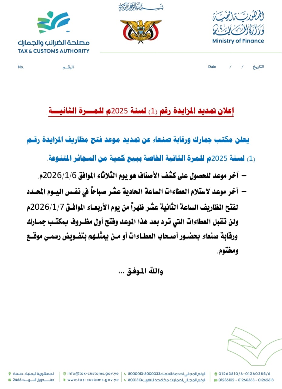 صنعاء سيتي // يعلن مكتب جمارك ورقابة صنعاء عن تمديد موعد فتح مظاريف المزايدة رقم (1) لسنة 2025م للمرة الثانية الخاصة ببيع كمية من السجائر المتنوعة. آخر موعد للحصول على كشف الأصناف هو يوم الثلاثاء الموافق 6/1/2026م. آخر موعد لاستلام العطاءات الساعة الحادية عشر صباحاً في نفس اليوم المحدد لفتح المظاريف الساعة الثانية عشر ظهراً […]