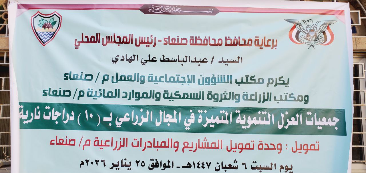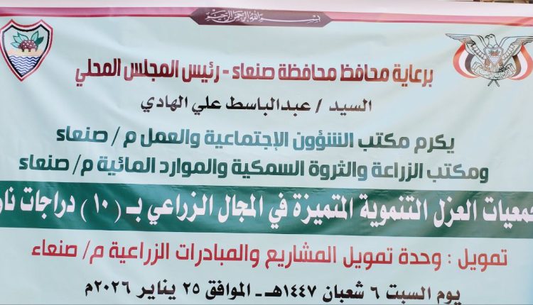 صنعاء سيتي | متابعات كرّم محافظ صنعاء، عبدالباسط الهادي، عدداً من جمعيات العزل التنموية المتميزة في القطاع الزراعي، بتقديم 10 دراجات نارية تبلغ قيمتها 4 ملايين و600 ألف ريال. ويأتي هذا الدعم، الممول من وحدة تمويل المشاريع والمبادرات الزراعية، في إطار فعالية نظمها مكتبا الشؤون الاجتماعية والزراعة بالمحافظة لتعزيز الأنشطة الميدانية وخدمة المجتمع. وأكد المحافظ […]