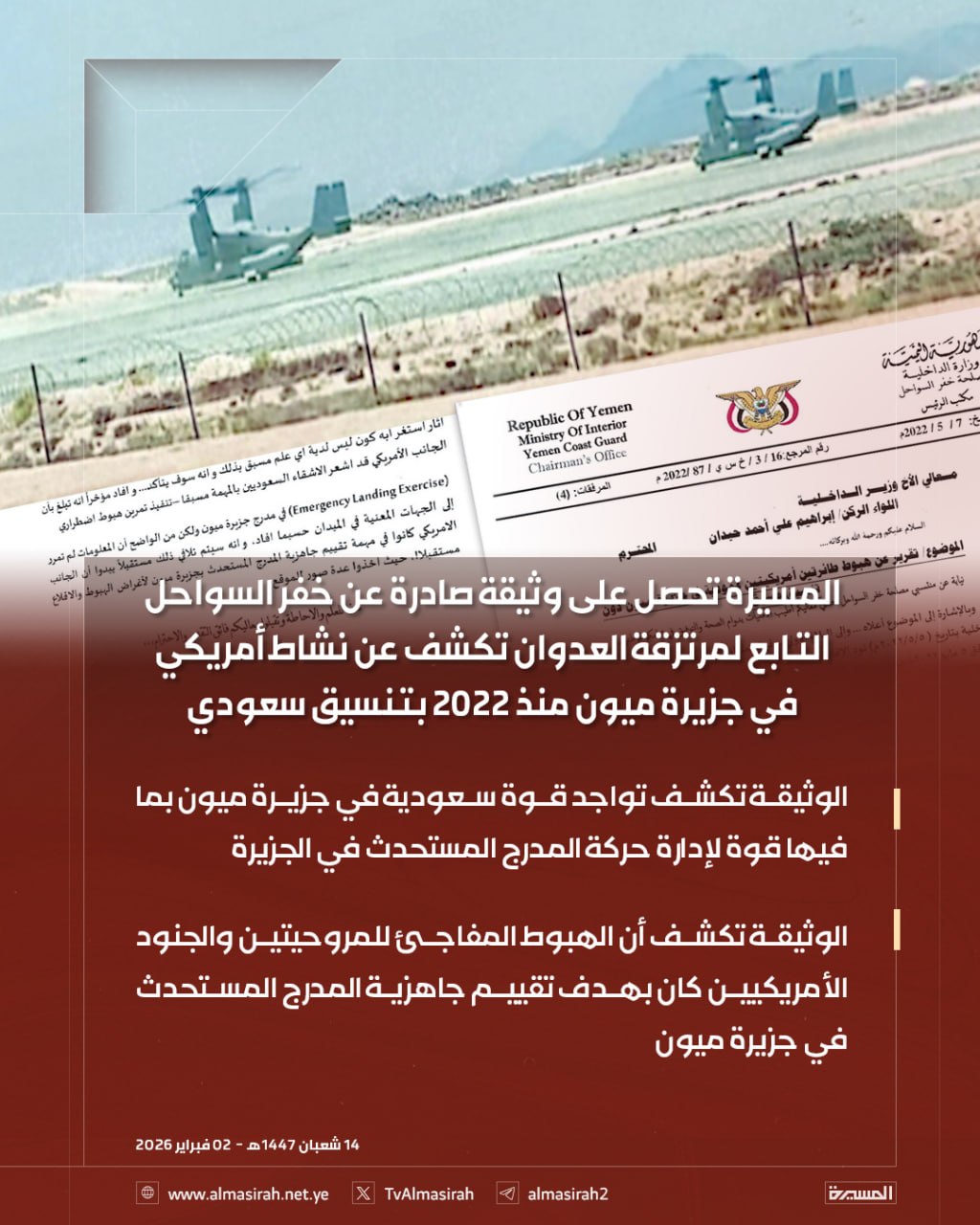 صنعاء سيتي | متابعات كشفت وثيقة رسمية صادرة عن “مصلحة خفر السواحل” التابعة للفصائل الموالية للتحالف، عن تفاصيل دقيقة تتعلق بنشاط عسكري أمريكي مباشر في جزيرة ميون الاستراتيجية الواقعة في قلب مضيق باب المندب، مؤكدة أن هذا النشاط بدأ وتصاعد منذ العام 2022 بتنسيق سعودي كامل. تضمنت الوثيقة بلاغاً عملياتياً يؤكد هبوط طائرتين أمريكيتين من […]