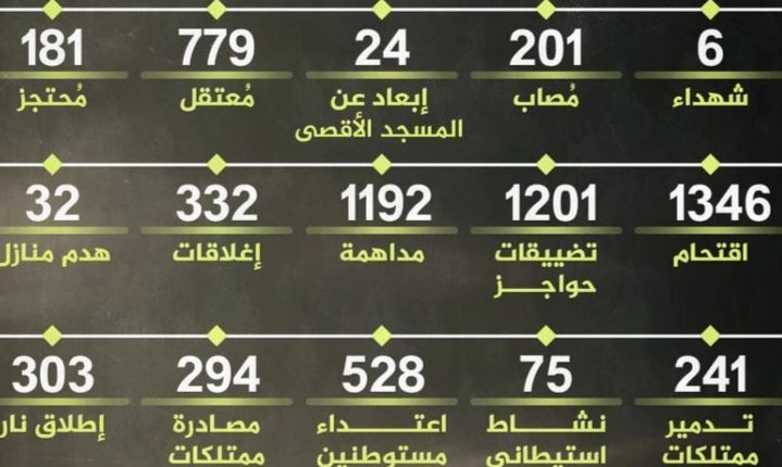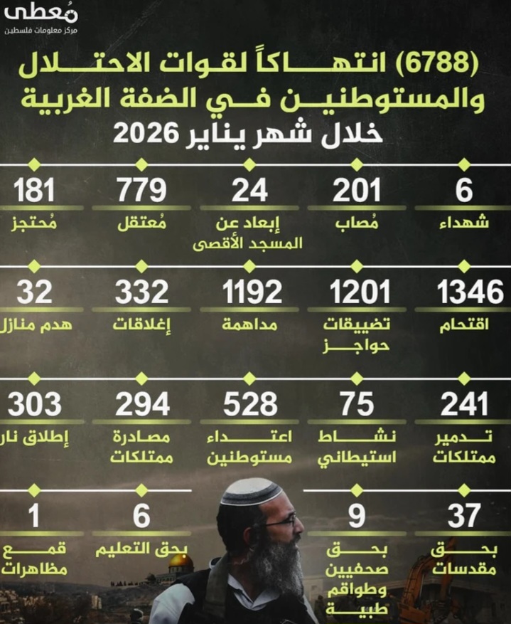 مركز المعلومات الفلسطيني مُعطى”: 6788 انتهاكًا للعدو الإسرائيلي في الضفة والقدس خلال يناير