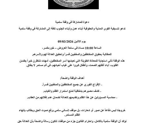 أفق نيوز| دعت “تنسيقية القوى المدنية والحقوقية”، اليوم الثلاثاء، أبناء مدينة عدن والمحافظات الجنوبية الاحتشاد والمشاركة الواسعة في وقفة سلمية كبرى، يوم الإثنين المقبل في ساحة العروض بمنطقة خور مكسر وسط مدينة عدن. وأكدت التنسيقية في بيان رسمي لها أن هذا التحرك يأتي للمطالبة بحقوق المختطفين والمخفيين قسرا، وتحقيق العدالة الناجزة لهم ولأسرهم التي تجرعت […]