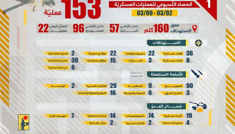 الثورة نت /.. أعلنت المقاومة الإسلامية في لبنان، مساء اليوم الثلاثاء، حصيلة عملياتها العسكرية للأسبوع الممتد بين 2 و9 مارس الجاري ضد العدو الصهيوني، مؤكدة تنفيذ 153 عملية عسكرية بمعدل يومي بلغ نحو 22 عملية، فيما وصل أقصى عمق للاستهداف إلى 160 كيلومترا. وقالت المقاومة، إن العمليات توزعت بين الأراضي اللبنانية والفلسطينية، حيث نُفِّذت 57 […]