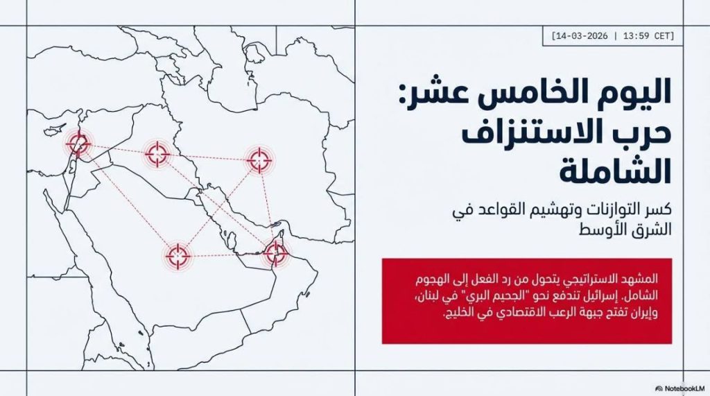 في منتصف اليوم الخامس عشر، وصلت “حرب الاستنزاف الشاملة” إلى منعطف خطير, فالميدان اللبناني يتحول إلى الفيصل الاستراتيجي، حيث تندفع إسـرائيل لغزو ما وراء الليطاني تحت غطاء “تسوية غــزة” بتواطؤ أمريكي، ليصطدم هذا الاندفاع بصلابة ح.ـزب الله الذي أقر بوضوح: “إما أن ننتهي في الحرب أو نغير المعادلة”. وفي الخليج، تفتح إيران جبــهة الرعب الداخلي […]