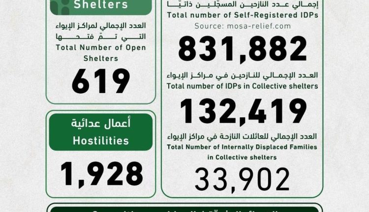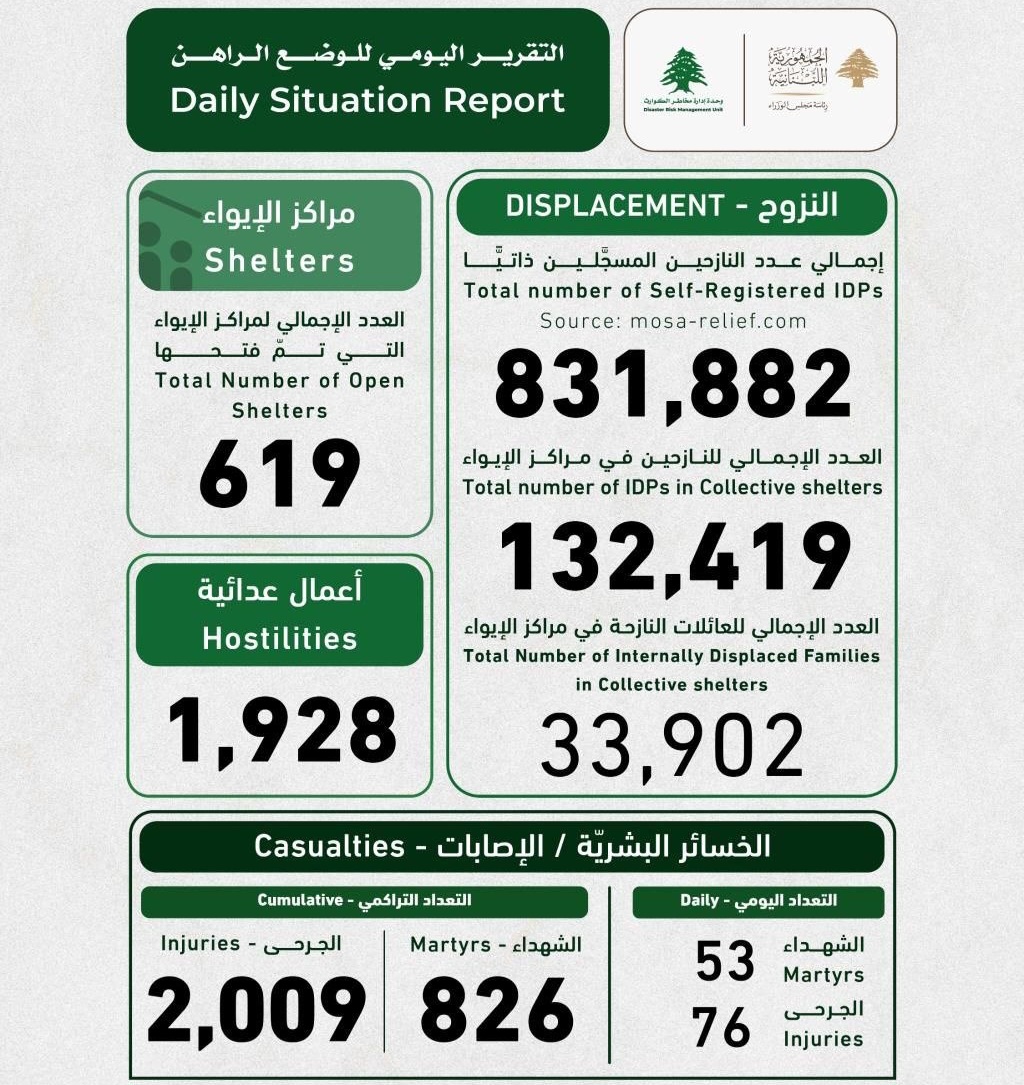 الثورة نت/.. ارتفع عدد النازحين في لبنان، جرّاء تصعيد العدوان الصهيوني منذ 2 مارس الجاري إلى 831,882 نازحاً مسجلاً ذاتيا. وقالت وحدة إدارة مخاطر الكوارث في رئاسة مجلس الوزراء اللبناني، في تقريرها اليومي، مساء أمس السبت، حول أعداد النازحين والشهداء والجرحى، إن من بين هؤلاء النازحين 132,419 نازحاً يحتويهم 619 مركز إيواء، مشيرة إلى […]