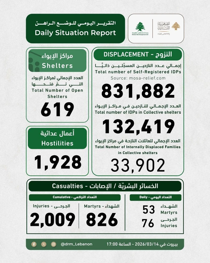 تصاعد العدوان الصهيوني يرفع عدد النازحين في لبنان إلى أكثر من 831 ألفا Share مارس 15, 2026 تصاعد العدوان الصهيوني يرفع عدد النازحين في لبنان إلى أكثر من 831 ألفا الذهاب إلى المصدر Share FacebookTwitterGoogle+ReddItWhatsAppPinterestEmail