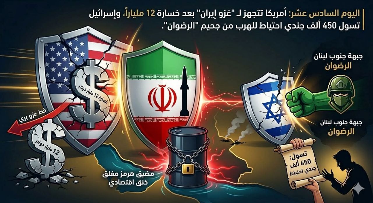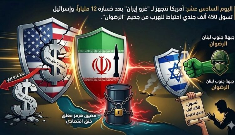 نهاية اليوم الـ16: أمريكا تتجهز لـ “غزو إيران” بعد خسارة 12 ملياراً، وإسرائيل تتسول 450 ألف جندي احتياط للهرب من جحيم “الرضوان”