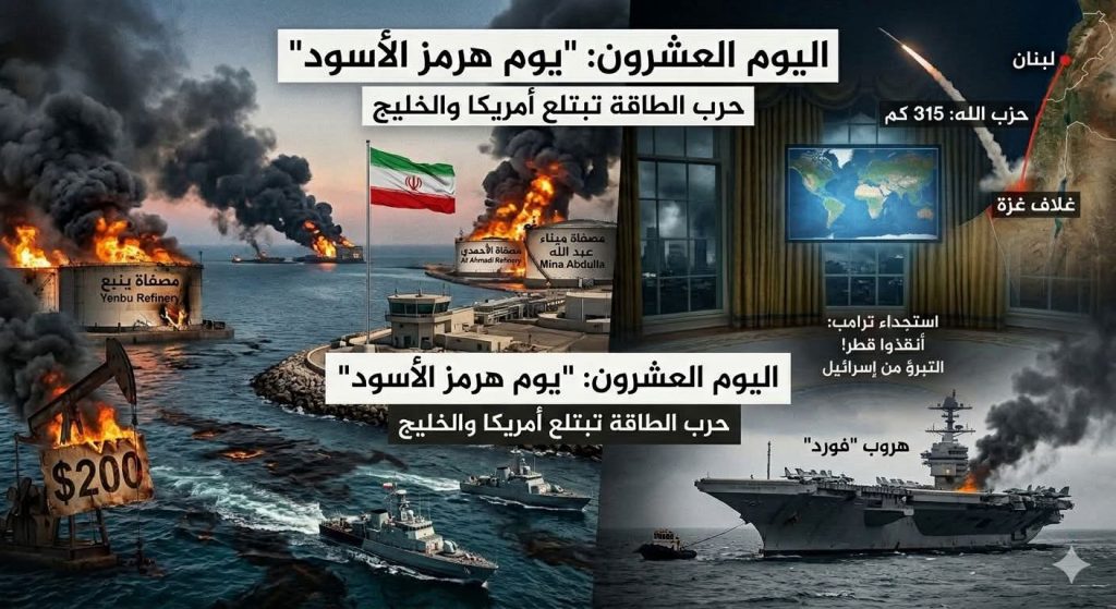 اليوم الـ20: “يوم هرمز الأسود” يبتلع أمريكا والخليج.. ترامب يتوسل لإنقاذ قطر، وإيران تُحرق مصفاة “ينبع” الأمريكية ومصافي الكويت!