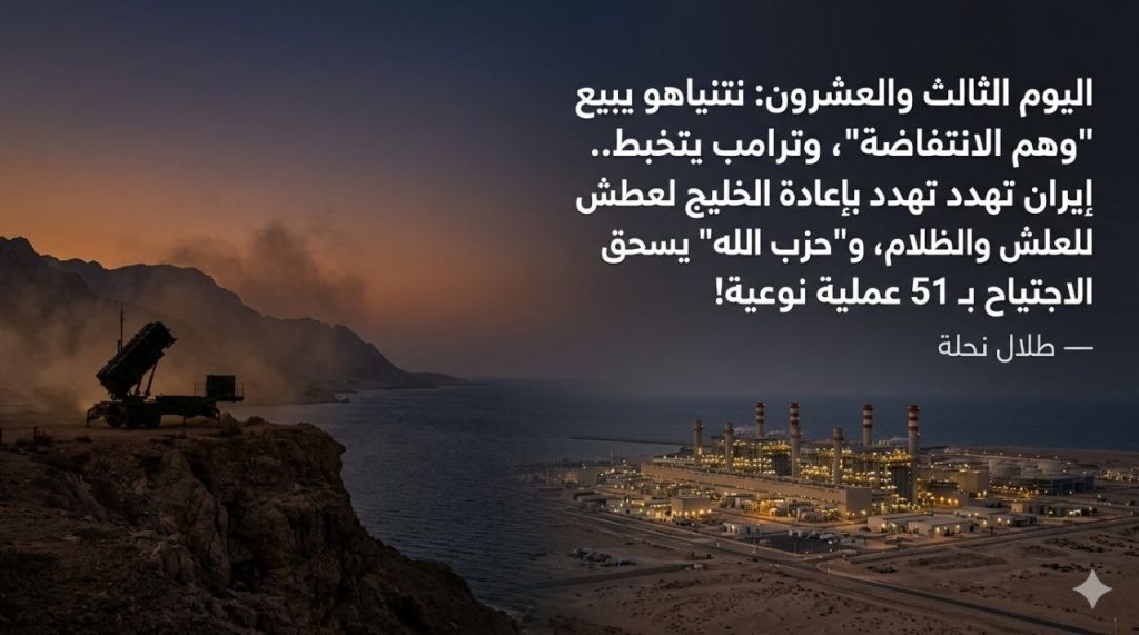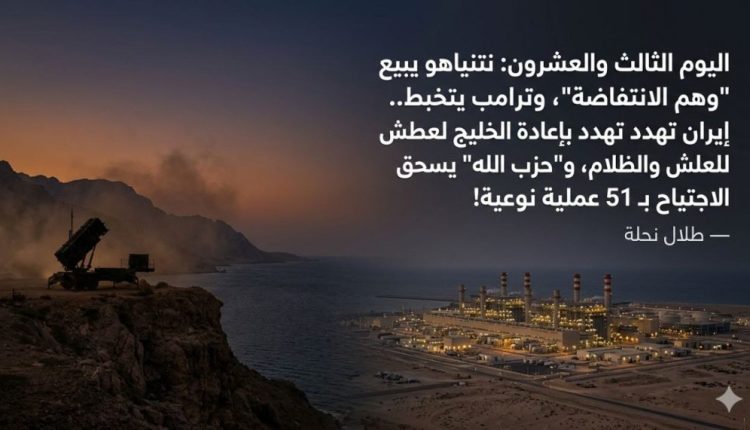 نهاية اليوم الـ23: نتنياهو يبيع “وهم الانتفاضة”، وترامب يتخبط.. إيران تهدد بإعادة الخليج للعطش والظلام، و”حزب الله” يسحق الاجتياح بـ 51 عملية نوعية