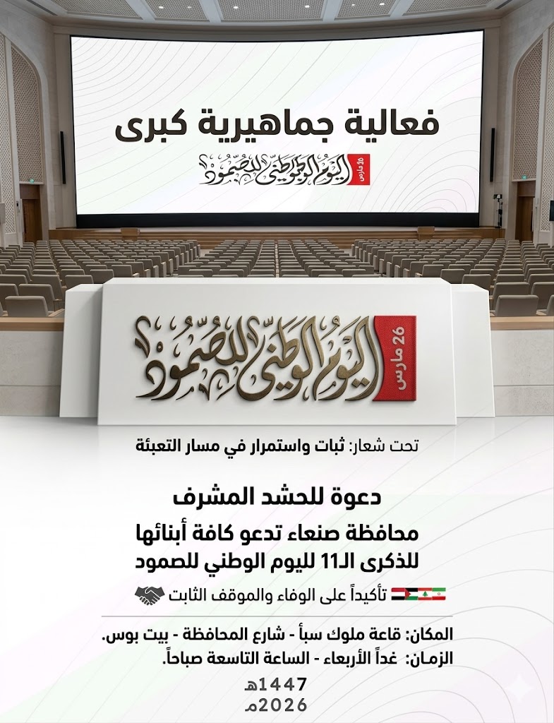 صنعاء سيتي | متابعات تحت شعار “ثبات واستمرار في مسار التعبئة”، دعت السلطة المحلية والتعبئة العامة بمحافظة صنعاء كافة أبناء المحافظة للحضور والمشاركة الواسعة في الفعالية المركزية لإحياء الذكرى الحادية عشرة لليوم الوطني للصمود. وتأتي هذه المناسبة تأكيداً على استمرارية الإعداد والنفير، وتجسيداً للموقف اليمني الثابت والمبدئي في مساندة قضايا الأمة، وعلى رأسها التضامن مع […]