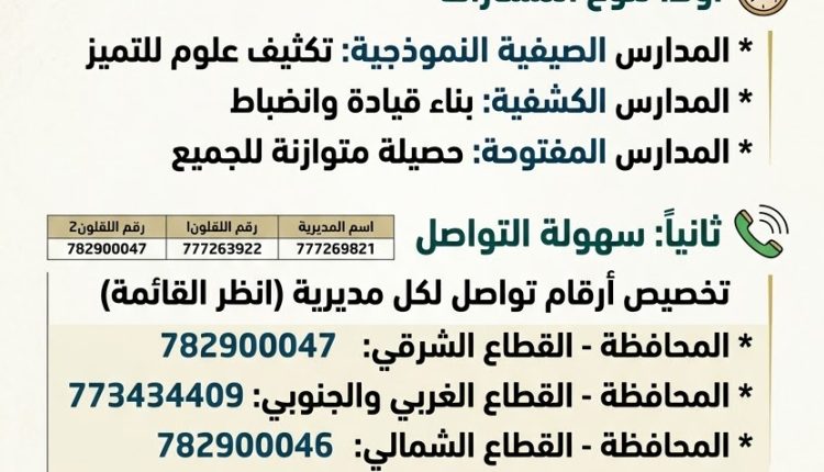صنعاء سيتي | متابعات انطلاقاً من الحرص على استغلال الإجازة الدراسية في بناء جيل متسلح بالعلم والوعي والهوية الإيمانية، وتجسيداً لاهتمام القيادة بالنشء والشباب، تعلن اللجنة الفرعية للدورات الصيفية بمحافظة صنعاء عن فتح باب التسجيل والاستعلام للالتحاق بالمدارس الصيفية في مختلف مديريات المحافظة. كما تستهدف المراكز الصيفية لهذا العام تقديم برامج نوعية وشاملة تتوزع على […]
