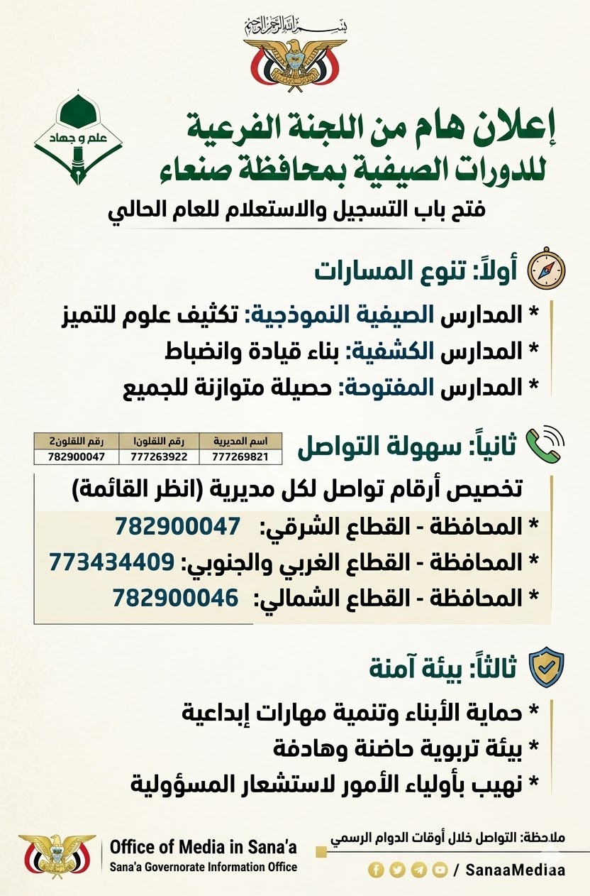 إعلان هام: اللجنة الفرعية للدورات الصيفية بمحافظة صنعاء تفتح باب الاستعلام والتسجيل للعام الحالي