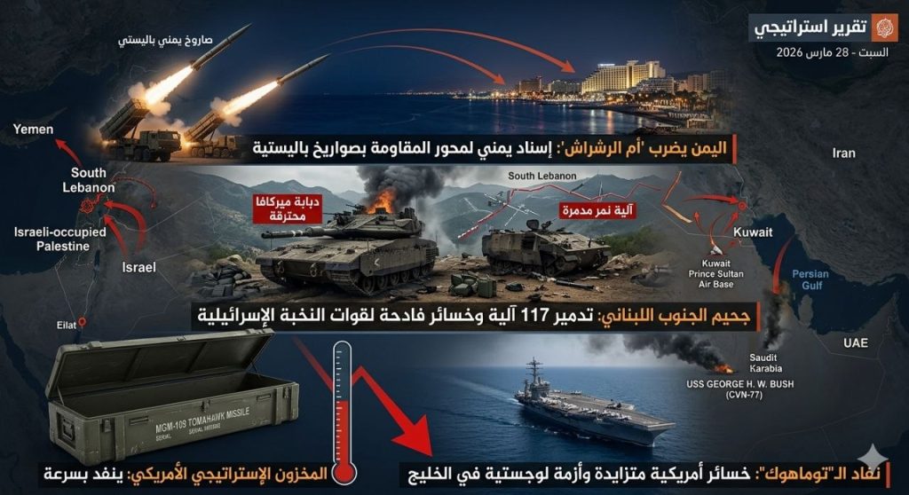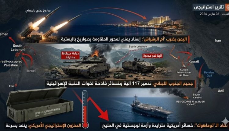 اليوم الـ29: اليمن يضرب “أم الرشراش”، وحزب الله يصطاد ضباط إسرائيل.. ونفاد صواريخ “توماهوك” يُعجل بالهزيمة الأمريكية في الخليج!