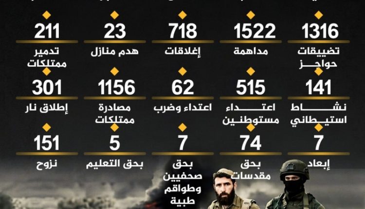 تقرير: استشهاد 30 فلسطينياً في 9406 انتهاكاً صهيونياً بالضفة والقدس المحتلة خلال مارس