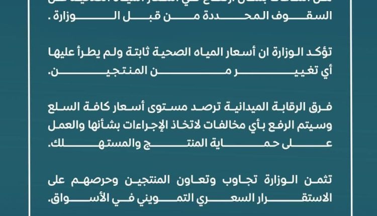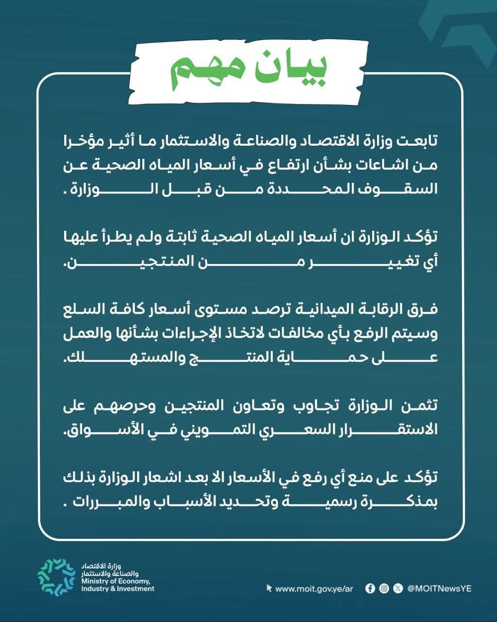 وزارة الاقتصاد بصنعاء تؤكد استقرار أسعار المياه الصحية وتتوعد المخالفين Share أبريل 5, 2026 صنعاء | وكالة الصحافة اليمنية الذهاب إلى المصدر Share FacebookTwitterGoogle+ReddItWhatsAppPinterestEmail