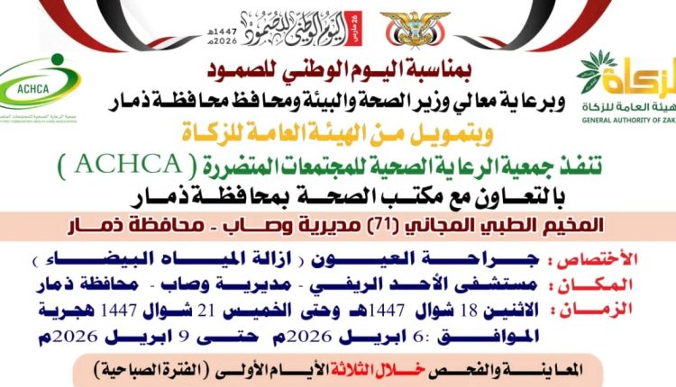 يمني برس || ذمار: تستعد مديريتا وصاب بمحافظة ذمار لاستقبال بارقة أمل إنسانية جديدة، حيث تدشن جمعية الرعاية الصحية للمجتمعات المتضررة، غداً الإثنين 18 شوال الموافق 6 إبريل مخيمها الطبي المجاني الـ71 لجراحة العيون، مستهدفةً تبديد عتمة المرض عن كواهل الفئات الأشد احتياجاً في مستشفى الأحد الريفي. ويأتي هذا التدخل الصحي النوعي، الذي يستمر حتى […]