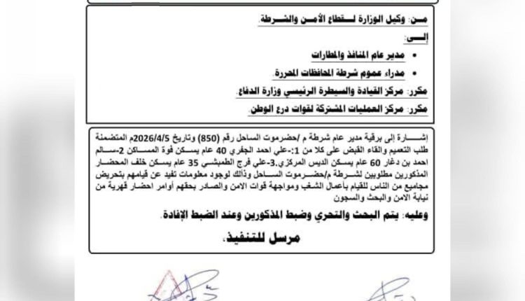 داخلية الإصلاح تصدر تعميما لكافة المنافذ بملاحقة 3 قيادات في الانتقالي “وثيقة” Share أبريل 6, 2026 خاص | وكالة الصحافة اليمنية | الذهاب إلى المصدر Share FacebookTwitterGoogle+ReddItWhatsAppPinterestEmail