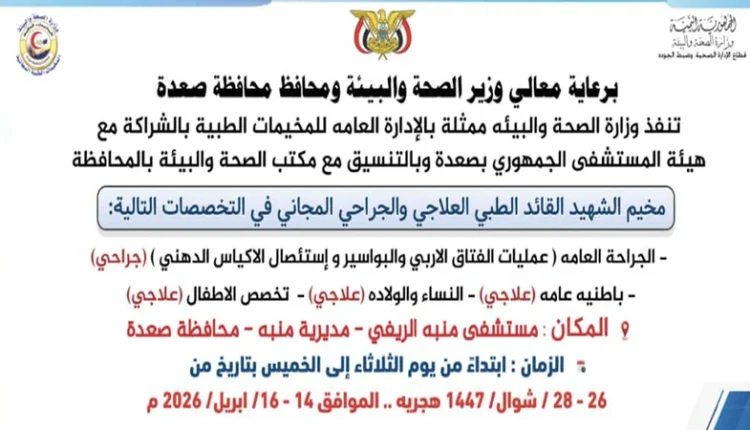 مخيم طبي مجاني بصعدة لإجراء عمليات جراحية وتقديم خدمات علاجية