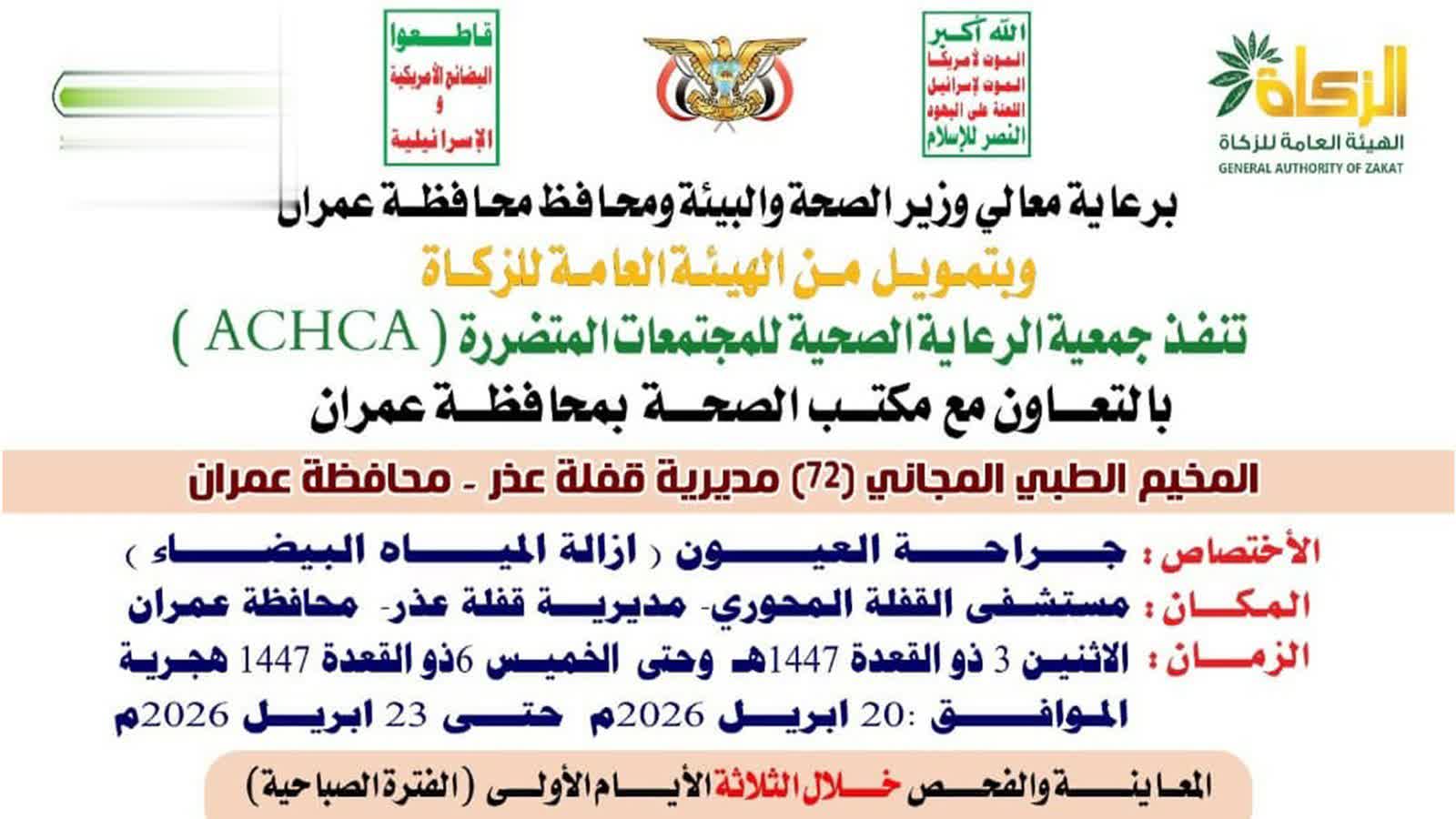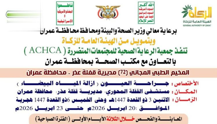 الثورة نت /.. تدشن جمعية الرعاية الصحية للمجتمعات المتضررة، الإثنين القادم، بمديرية قفلة عذر في محافظة عمران المخيم الطبي المجاني الـ(72) لجراحة العيون، بالتزامن مع الذكرى السنوية للصرخة. يهدف المخيم الذي سيقام في مستشفى القفلة المحوري بالمديرية خلال الفترة من 3 ـ 6 ذو القعدة بتمويل من الهيئة العامة للزكاة وبالتنسيق مع وزارة الصحة والبيئة، […]