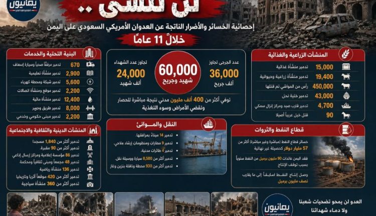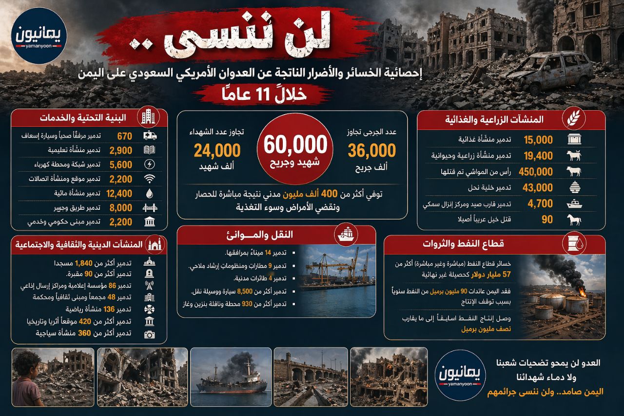 انفوجرافيك | يوثق احصائية الخسائر الناتجة عن العدوان الأمريكي السعودي على اليمن خلال 11 عام Share أبريل 23, 2026 انفوجرافيك | يوثق احصائية الخسائر الناتجة عن العدوان الأمريكي السعودي على اليمن خلال 11 عام #لن_ننسى الذهاب إلى المصدر Share FacebookTwitterGoogle+ReddItWhatsAppPinterestEmail