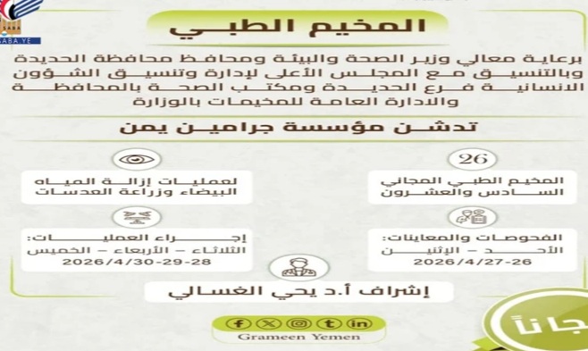 الأحد المقبل: تدشين المخيم الطبي المجاني الـ26 لطب وجراحة العيون بالحديدة
