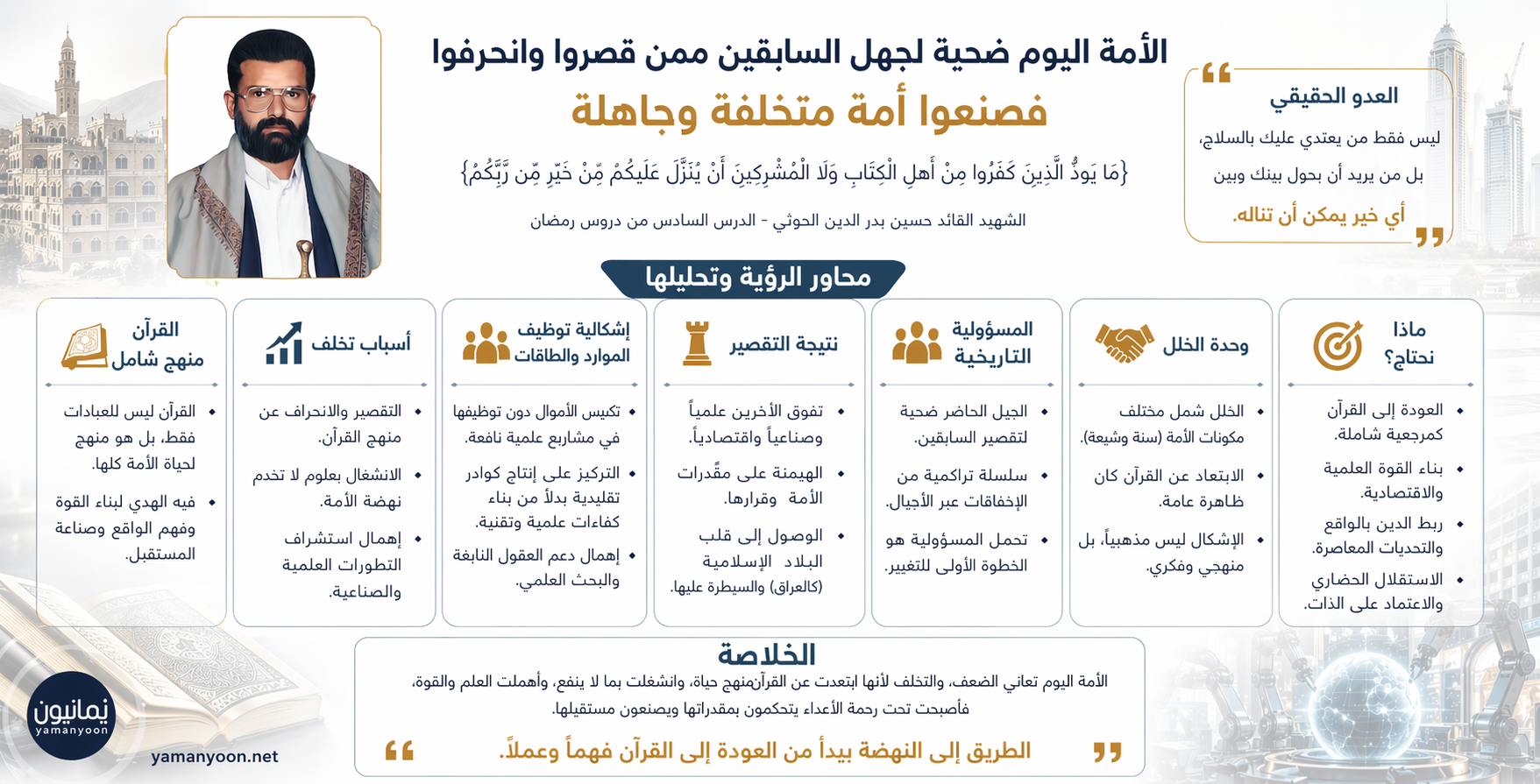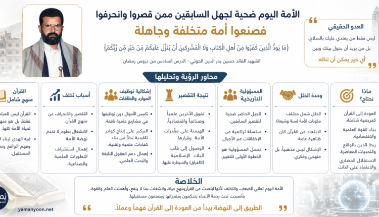 في قراءةٍ تحليلية موسّعة لرؤية الشهيد القائد حسين بدر الدين الحوثي كما وردت في الدرس السادس من دروس رمضان، تتكشف أبعاد فكرية عميقة تتجاوز الطرح الوعظي التقليدي إلى بناء رؤية نقدية شاملة لواقع الأمة، تربط بين الماضي والحاضر، وتُحمّل المسؤولية التاريخية لتراجع الأمة إلى اختلالات في الفهم والتطبيق لمنهج القرآن الكريم. يمانيون | أعده للنشر […]