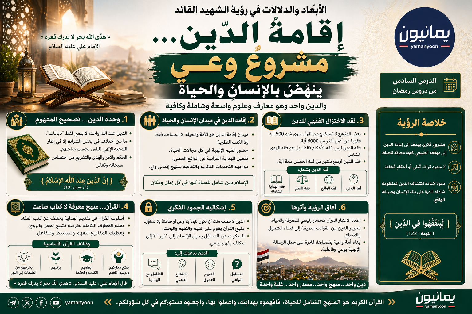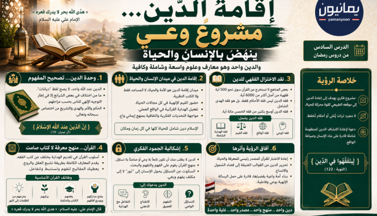 في سياق المشروع القرآني النهضوي، يقدّم الشهيد القائد السيد حسين بدر الدين الحوثي رضوان الله عليه في الدرس السادس من دروس رمضان، رؤية متكاملة لمفهوم “إقامة الدين”، بوصفه ليس مجرد التزام طقوسي أو منظومة أحكام فقهية جامدة، بل باعتباره مشروعًا شاملًا يمتد في عمق الإنسان، ويتحرك في واقع الحياة بكل تفاصيلها. هذه الرؤية تعيد تعريف […]