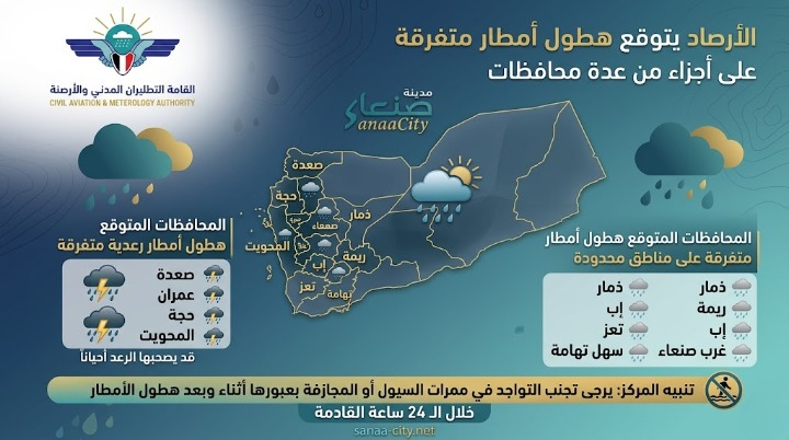 صنعاء سيتي | متابعات توقع المركز الوطني للأرصاد والإنذار المبكر هطول أمطار متفرقة على أجزاء واسعة من المحافظات اليمنية خلال الـ 24 ساعة القادمة، وسط تحذيرات من اضطرابات جوية قد تصحبها صواعق رعدية. ووفقاً للنشرة الجوية الصادرة عن المركز، فإن التوقعات تشير إلى: أمطار رعدية: احتمال هطول أمطار متفرقة يصحبها الرعد أحياناً على أجزاء من […]