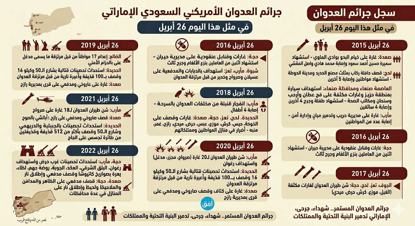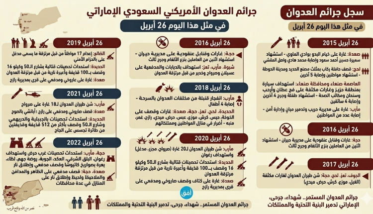 في مثل هذا اليوم 26 أبريل جرائم العدوان الأمريكي السعودي الإماراتي بحق اليمن