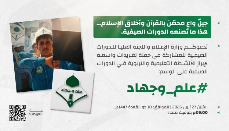 يمني برس || صنعاء: من المقرر أن تنطلق في الساعة التاسعة من مساء اليوم الاثنين 10 ذو القعدة الموافق 27 إبريل حملة تغريدات عبر موقع التواصل الاجتماعي “إكس”، بعنوان “جيلٌ واعٍ محصَّن بالقرآن وأخلاق الإسلام… هذا ما تصنعه الدورات الصيفية” تنظمها وزارة الإعلام واللجنة العليا للدورات الصيفية . ودعت الوزارة واللجنة إلى المشاركة الواسعة فيها بهدف إبراز […]