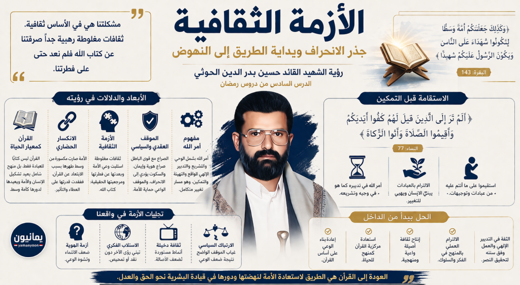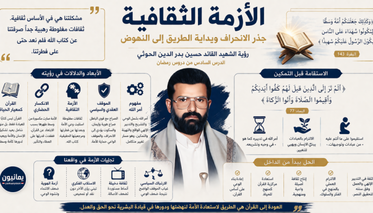 في زمن تتزاحم فيه التحديات على الأمة الإسلامية، يقدّم الشهيد القائد حسين بدر الدين الحوثي رضوان الله عليه، قراءة مختلفة لطبيعة الأزمة، قراءة لا تتوقف عند حدود السياسة أو الاقتصاد، بل تغوص عميقاً في الجذر الحقيقي، (الثقافة)، فبحسب هذه الرؤية، لم يكن التراجع وليد لحظة، بل نتيجة تراكمات ثقافية مغلوطة أعادت تشكيل وعي الإنسان المسلم، […]