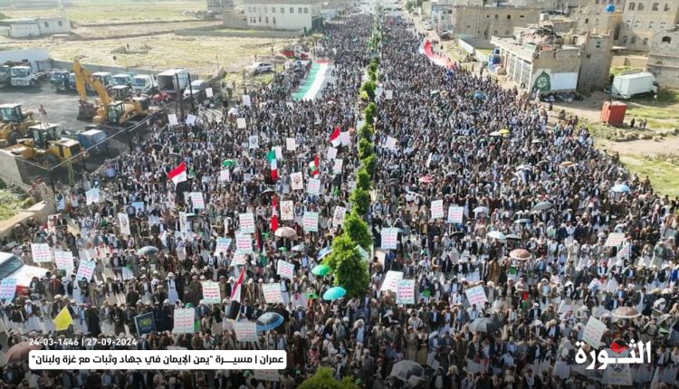 الثورة نت../ شهدت محافظة عمران اليوم، 45 مسيرة حاشدة تحت شعار “يمن الإيمان في جهاد وثبات مع غزة ولبنان” تأكيداً على الاستمرار في نصرة الشعبين الفلسطيني واللبناني. ونددت الحشود الجماهيرية بجرائم كيان العدو الصهيوني المستمرة في فلسطين ولبنان.. مؤكدة أن العدو الصهيوني يتجاوز كل الخطوط الحمراء ويستخف بكل الأعراف والقوانين الدولية. ورددت الجماهير الهتافات المؤكدة […]