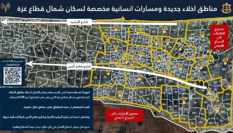 الثورة نت/.. أصدر جيش العدو الصهيوني اليوم الأحد، أوامر جديدة بإخلاء فوري لمدينة غزة وشمالها وفق الخريطة التي أرفقها ، مؤكداً دخوله لمرحلة جديدة من العدوان على القطاع. وقال جيش العدو في بيان له: “إلى سكان شمال قطاع غزة، ️حماس تواصل محاولاتها ترسيخ بنيتها في منطقتكم مستغلة السكان والمأوي والمنشآت الصحية درعًا بشريًا، ️ينشر (الجيش […]